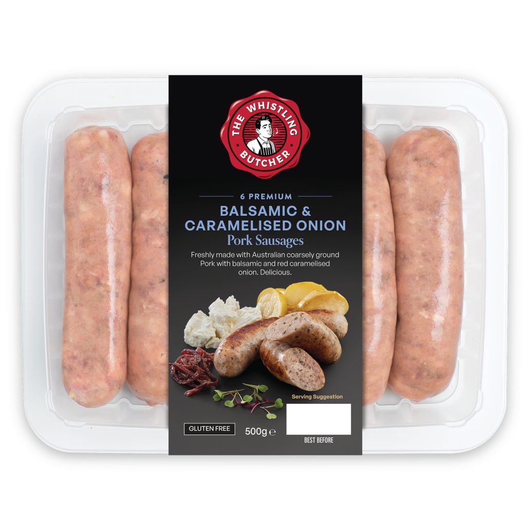 Freshly made with Australian coarsely ground Pork with balsamic and red caramelised onion. Delicious.